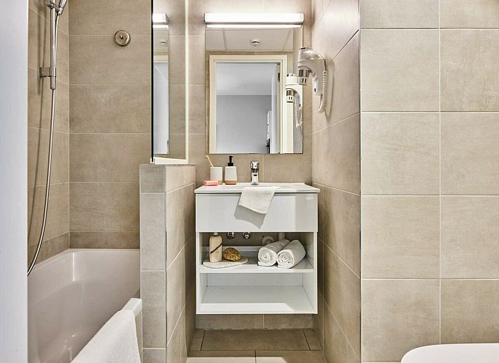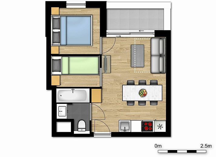 Cette location de vacances pour 6 personnes dispose d'une chambre avec un lit double pour 2 personnes, d'un coin nuit avec un lit superposé pour 2 personnes et d'un canapé-lit pour 2 personnes dans le salon. Cette suite de vacances est équipée de tout le confort et dispose d'un agréable salon avec une télévision et un balcon. La cuisine ouverte est entièrement équipée (réfrigérateur, plaques de cuisson, four combiné, bouilloire, cafetière, casseroles et poêles, vaisselle, lave-vaisselle). Ce logement dispose d'une salle de bains avec baignoire, lavabo et toilettes.