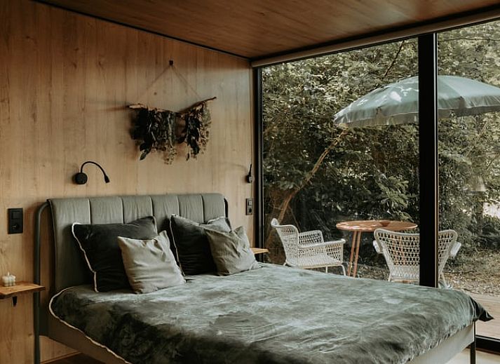 Notre charmante cabane forestière se trouve sur une parcelle de forêt privée et offre une vue magnifique sur la prairie depuis votre lit.
