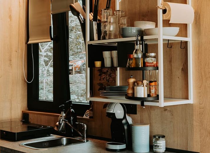 - Petite cuisine avec cuisinière à induction, réfrigérateur et petits équipements