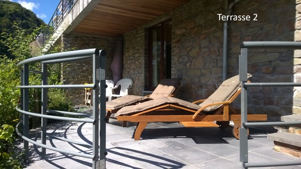 À louer : maison de vacances entièrement rénovée(2025) en pierre bleue de Mouzaive, avec abri voiture. Elle bénéficie de matériaux de qualité (marbre, parquet en chêne, travertin italien et toiture neuve). Trois terrasses (57 m²) à différents niveaux offrent une vue panoramique exceptionnelle à 180° sur la Semois, le village de Bohan et les collines environnantes. Un séjour avec escalier ouvert (barrière de sécurité disponible) connecte les étages supérieurs rénovés, comprenant trois chambres, 6 lits et un lit bébé. La cuisine moderne est équipée d'un four avec plaques électriques, d'un lave-vaisselle, d'un réfrigérateur avec petit compartiment réfrigéré, de deux cafetières et d'un fer à repasser. La salle de bains, en travertin italien, dispose d'une baignoire et d'une douche. Deux WC complètent le rez-de-chaussée. Un lave-linge Bosch est à disposition.