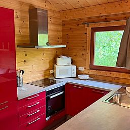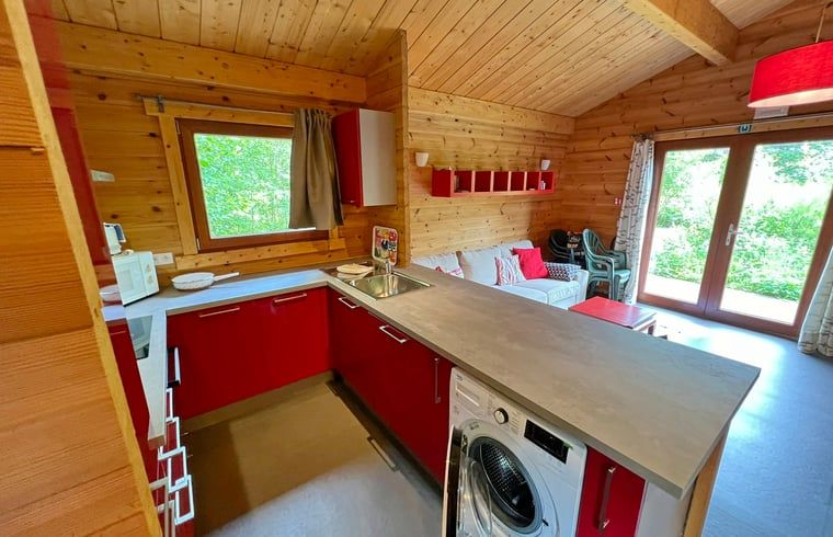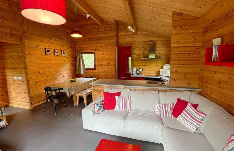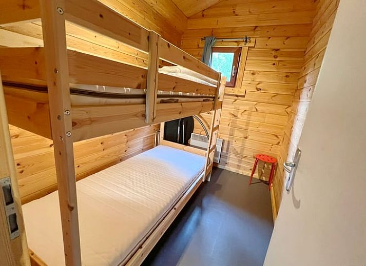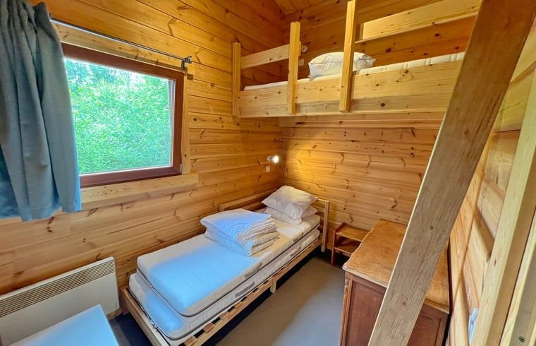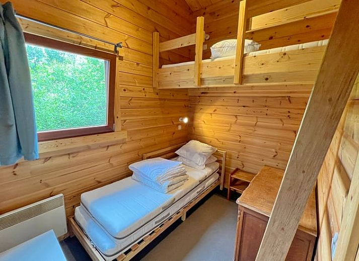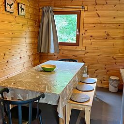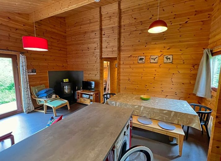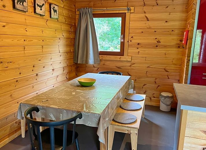Ce gîte naturel pour 6 personnes est situé au milieu des bois dans le parc de vacances. Salle de séjour avec coin salon (avec poêle à bois) et coin repas. Cuisine ouverte équipée avec micro-ondes, lave-vaisselle, plaques électriques, four et réfrigérateur-congélateur. 2 chambres à coucher, 1 salle de bain avec douche et WC séparé. Terrasse avec mobilier de jardin. Chauffage électrique. Lits : 1 x lit double, 1 x lit simple. + 1 x lit supérieur 1 pers., 1 x lits superposés. NON-FUMEURS. ANIMAUX NON ADMIS.